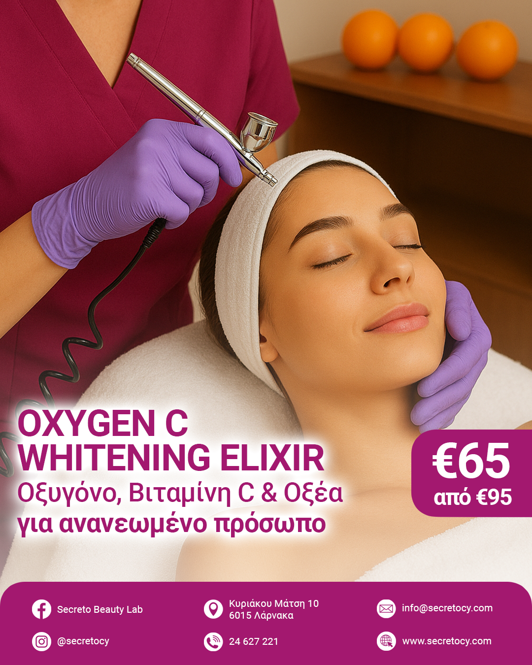 Η νέα μας λευκαντική θεραπεία με Οξέα Φρούτων και Βιταμίνη C σε συνδυασμό με Οξυγονοθεραπεία προσφέρει άμεση αναζωογόνηση και βαθιά οξυγόνωση των κυττάρων, βελτιώνοντας ταυτόχρονα τον τόνο της επιδερμίδας.